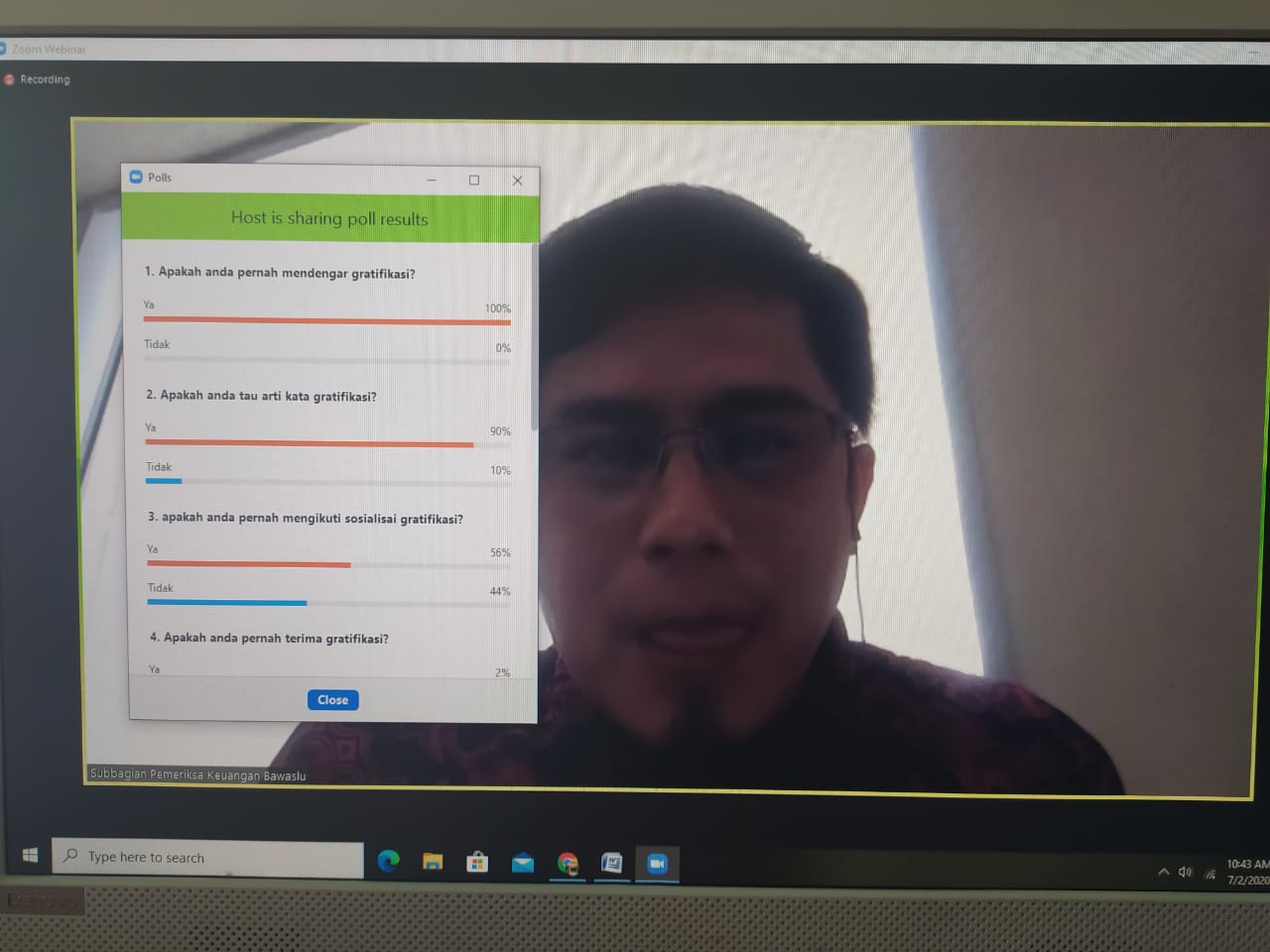 Kota Kediri, 02 Juli 2020. Koordinator Divisi SDM beserta Koordinator Sekretariat Bawaslu Kota Kediri mengikuti Video Conference Sosialisasi Pengendalian Grafitikasi yang diadakan oleh Bawaslu RI. Acara ini dimulai pada pukul 10.00 WIB yang diikuti oleh Bawaslu Provinsi Jawa Timur dan seluruh Bawaslu Kabupaten/Kota se-Jawa Timur. Pemandu acara ini yakni saudari Niken Betari sedangkan pemateri pada acara ini yakni Agustin Rafikasari dan Aceng Purkon. Sebelum materi dimulai, ada polling yang berhubungan dengan Gratifikasi yang dipandu oleh Bapak Sonta Saputra dan diisi oleh peserta Vidcon. Ibu Agustin Rafikasari menjelaskan tentang gratifikasi secara umum dan pengendaliannya berdasarkan Perbawaslu No. 6 tahun 2015 tentang pengendalian gratifikasi di lingkungan Bawaslu. Gratifikasi merupakan pemberian uang, rabat, komisi, pinjaman tanpa bunga, tiket perjalanan, fasilitas penginapan, perjalanan wisata, pengobatan cuma-cuma dan fasilitas lainnya yang diberikan oleh menggunakan sarana elektronik maupun non elektronik. Hal-hal yang diatur dalam Perbawaslu Gratifikasi meliputi Pencegahan Gratifikasi, Unit Pengendalian Gratifikasi, Tata cara Pelaporan serta perlindungan, penghargaan dan sanksi. Sesuai Perbawaslu no. 6 tahun 2015 pada pasal 3 mewajibkan untuk menolak gratifikasi yang meliputi: