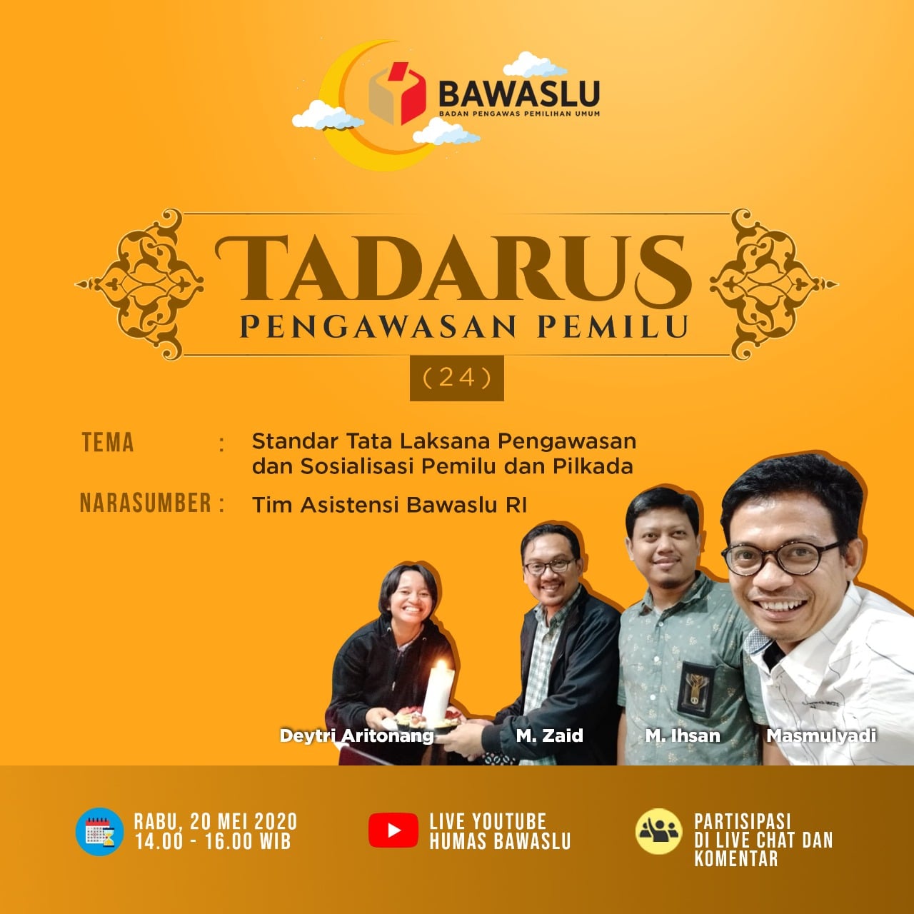 Kota Kediri. Bawaslu Kota Kediri masih mengikuti Tadarus Pengawasan Pemilu ke-24. Kali ini mengangkat tema Standar Tata Laksana Pengawasan dan Sosialisasi Pemilu dan Pilkada yang disampaikan oleh 4 narasumber dari Tim Asistensi Bawaslu Republik Indonesia yaitu, Masmulyadi, M. Ihsan, M. Zaid dan Deytri Aritonang, ditayangkan live melalui Youtube mulai pukul 14.00 WIB pada Rabu, 20 Mei 2020.
