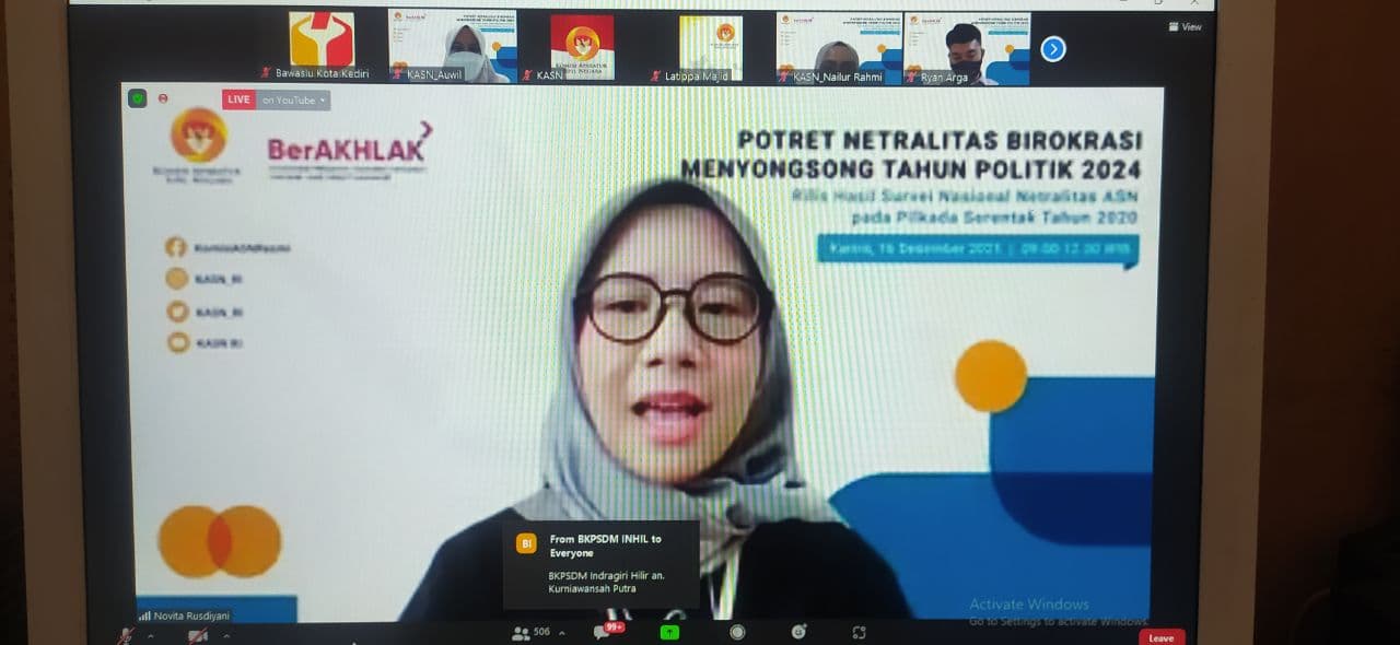 Kota Kediri, 16 Desember 2021. Bawaslu Kota Kediri mengikuti Webinar Potret Netralitas Birokrasi Menyongsong Tahun Politik 2024 yang diadakan oleh Komisi Aparatur Sipil Negara (KASN) yang dilakukan melalui zoom meeting pukul 09.00 WIB. Kegiatan ini juga diikuti oleh Bawaslu Provinsi maupun Kabupaten/Kota seluruh Indonesia.