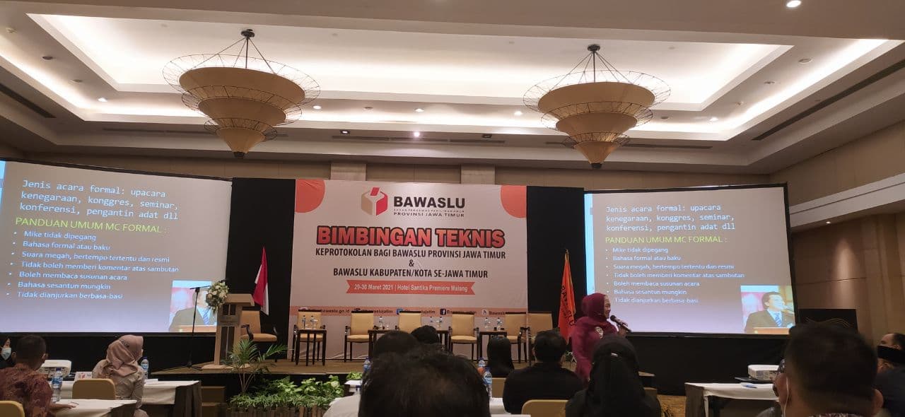 Kota Malang, 29 Maret 2021. Dalam Bimtek Keprotokolan Bagi Bawaslu Provinsi Jawa Timur dan Bawaslu Kabupaten/Kota se-Jawa Timur di Hotel Santika Premiere Malang Dr. Tutik Purwaningsih, M.Psi selaku pemateri Teknik Pranata Acara dalam Kegiatan Resmi yang membahas terkait Master of Ceremony.