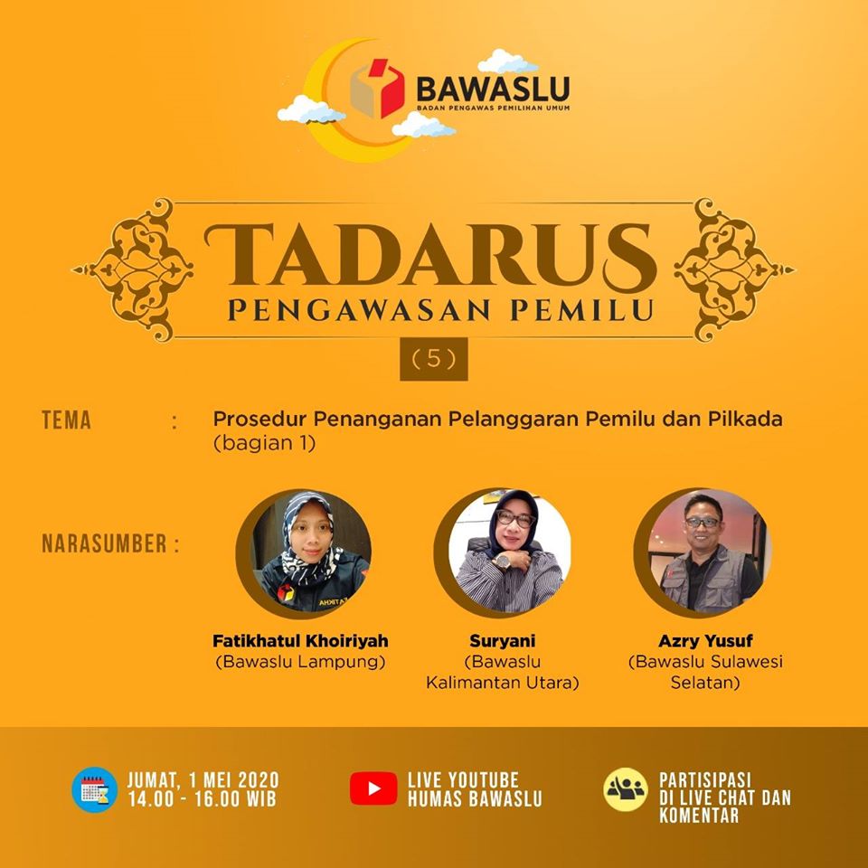 Kota Kediri. Bawaslu Kota Kediri masih setia mengikuti Tadarus Pengawasan Pemilu Bawaslu RI, kali ini tanggal 1 Mei 2020 bertepatan dengan Hari Buruh mengambil bahasan Prosedur Penanganan Pelanggaran Pemilu dan Pilkada yang disampaikan oleh Fatihatul Khoiriyah (Bawaslu Lampung), Suryani (Bawaslu Kalimantan Utara) dan Azry Yusuf (Bawaslu Sulawesi Selatan).
