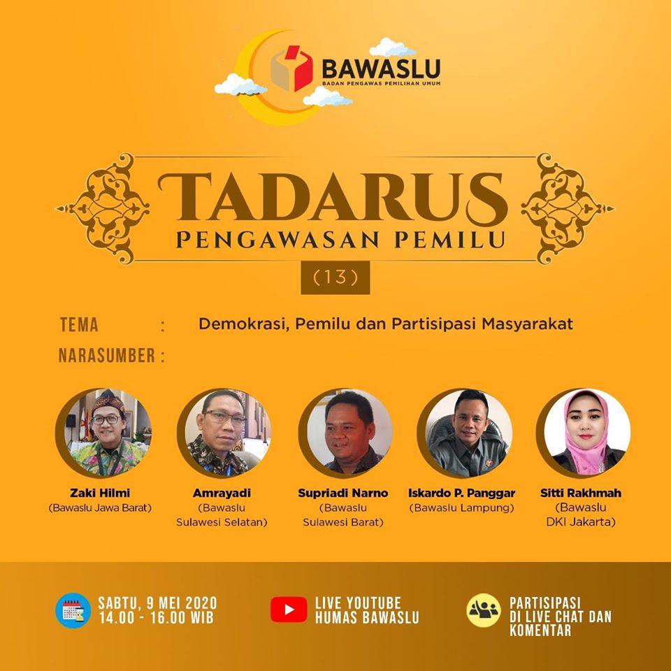 Kota Kediri. Bawaslu Kota Kediri selalu mengikuti Tadarus Pengawasan Pemilu. Kali ini materi ke-13 dengan topik Demokrasi, Pemilu dan Partisipasi Masyarakat serta narasumber Zaki Hilmi (Bawaslu Jawa Barat), Amrayadi (Bawaslu Sulawesi Selatan), Supriadi Narno (Bawaslu Sulawesi Barat), Iskardo P Panggar (Bawaslu Lampung) dan Sitti Rakhmah (Bawaslu DKI Jakarta) yang ditayangkan live melalui Youtube pada tanggal 9 Mei 2020 pukul 14.00 sampai selesai.