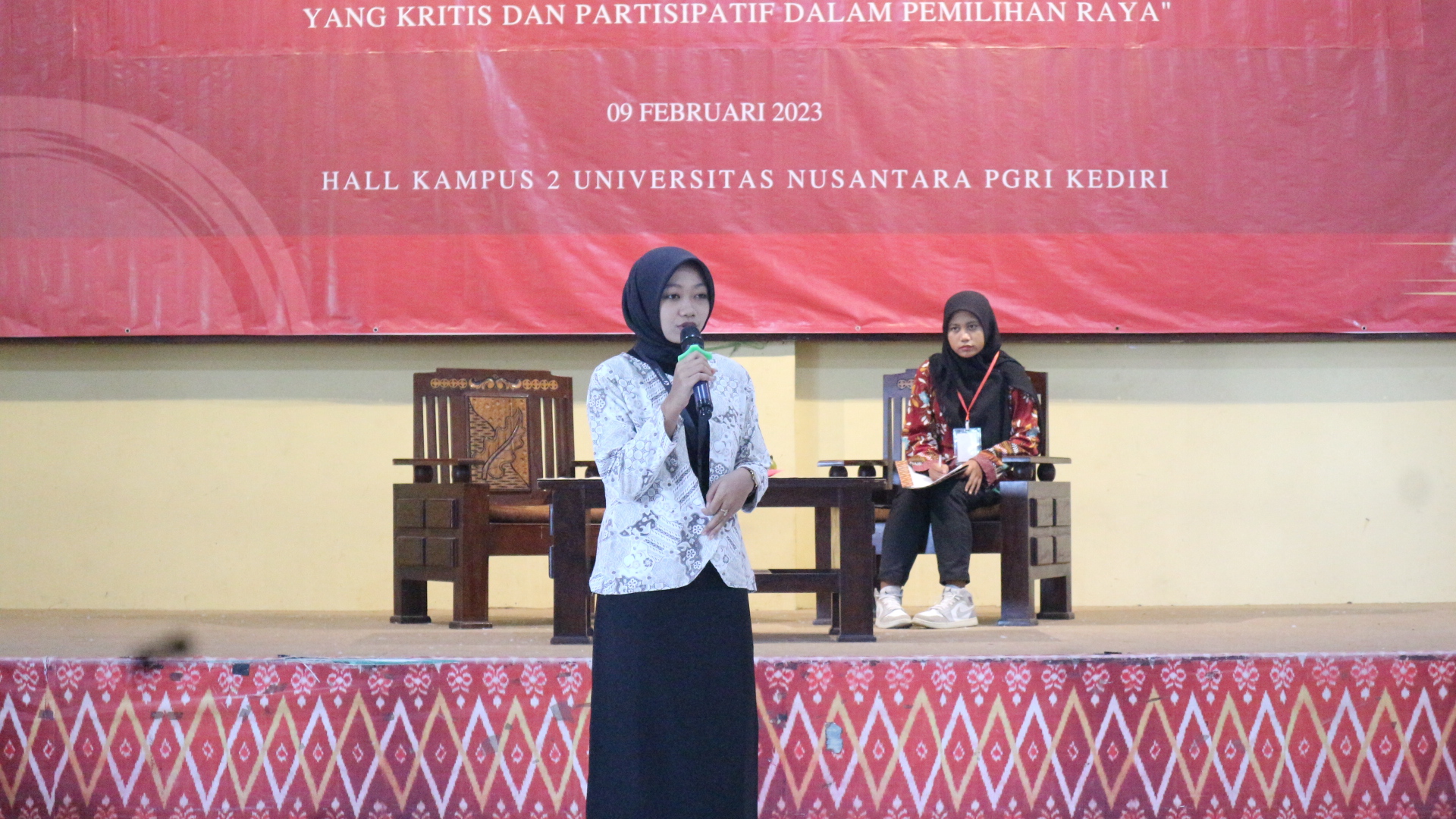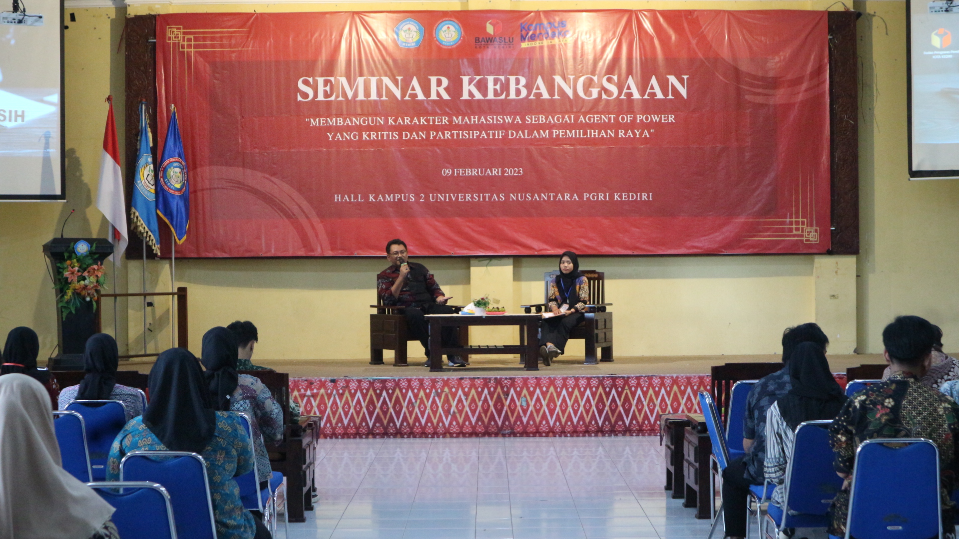 Kota Kediri, 09 Februari 2023. Bawaslu Kota Kediri menjadi Narasumber dalam Seminar Kebangsaan di UN PGRI Kediri. Kegiatan ini diadakan oleh BPPRM (Badan Pengawas Pemilihan Raya Mahasiswa) UN PGRI Kediri yang diikuti oleh Mahasiswa semua jurusan dengan total peserta kurang lebih 86 orang.