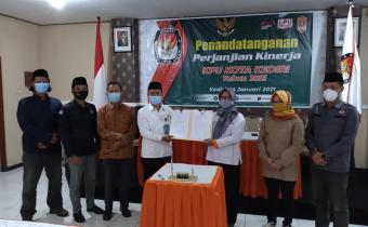 Kota Kediri. Ketua Bawaslu Kota Kediri menghadiri undangan KPU Kota Kediri dalam penandatanganan kontrak kinerja KPU Kota Kediri untuk tahun 2021 pada 14 Januari 2021 di ruang RPP.